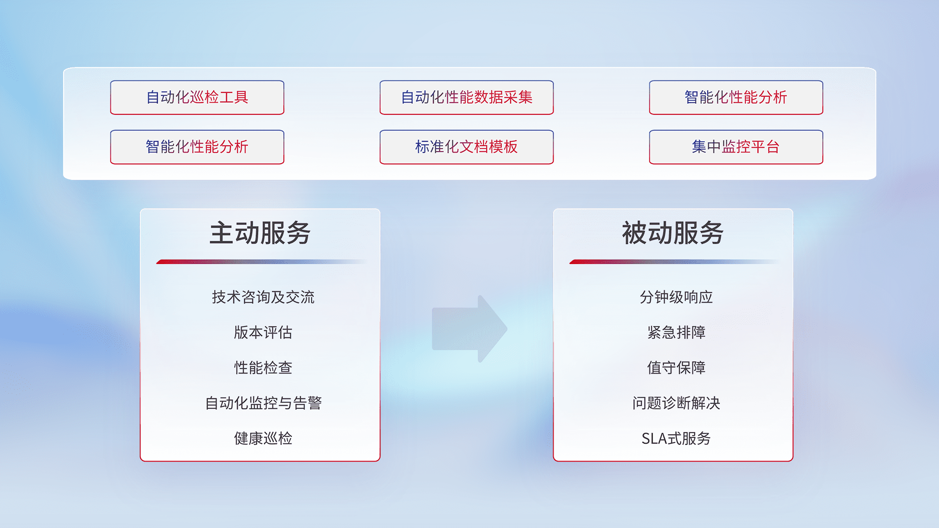 智能化工具和标准化文档,,,,保障服务质量,,,,提供主动服务(包含技术咨询、、、版本评估、、性能检查、、、自动化监控与告警、、、、健康巡检)和被动服务包含(分钟级响应、、紧急排障、、、、值守保障、、问题诊断解决、、、SLA服务)。。。。