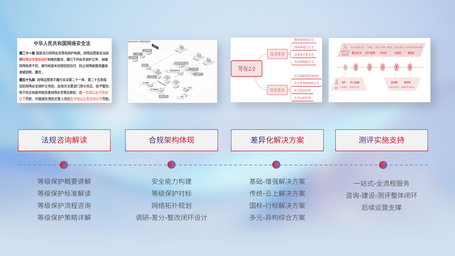 通过专业的法律咨询解读、、、合规架构体现、、、差异化解决方案、、、测试实施支持等服务,,,,为客户量身打造等保合规体系。。。